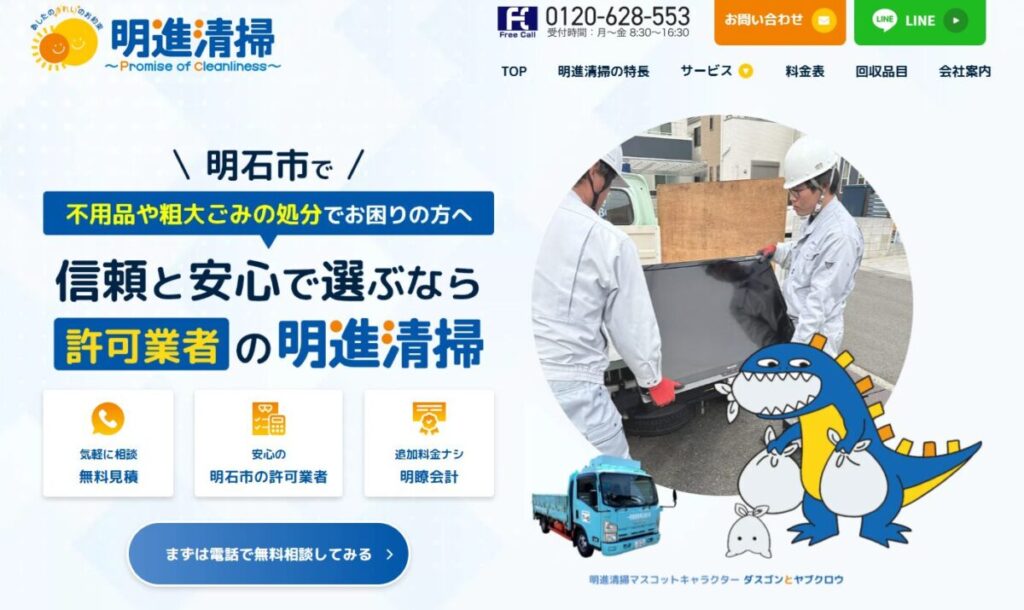 兵庫県明石市で創業50年以上の実績を持つ「有限会社明進清掃」が運営する不用品回収サービスの紹介サイトです。