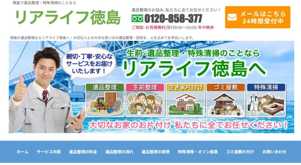 「リアライフ徳島」は、徳島県全域で遺品整理や生前整理、特殊清掃を行う専門業者です。